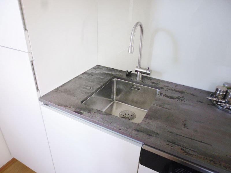 Modernes Design trifft auch höchste Funktionalität: Die verwendete Dekton-Arbeitsplatte bietet eine angenehm glatte Oberfläche mit hervorragenden Reinigungseigenschaften. Hinzu kommen eine hohen Flecken- und Kratzfestigkeit. Optisch die perfekte Ergänzung zur sonst weiß gehaltenen Küche.